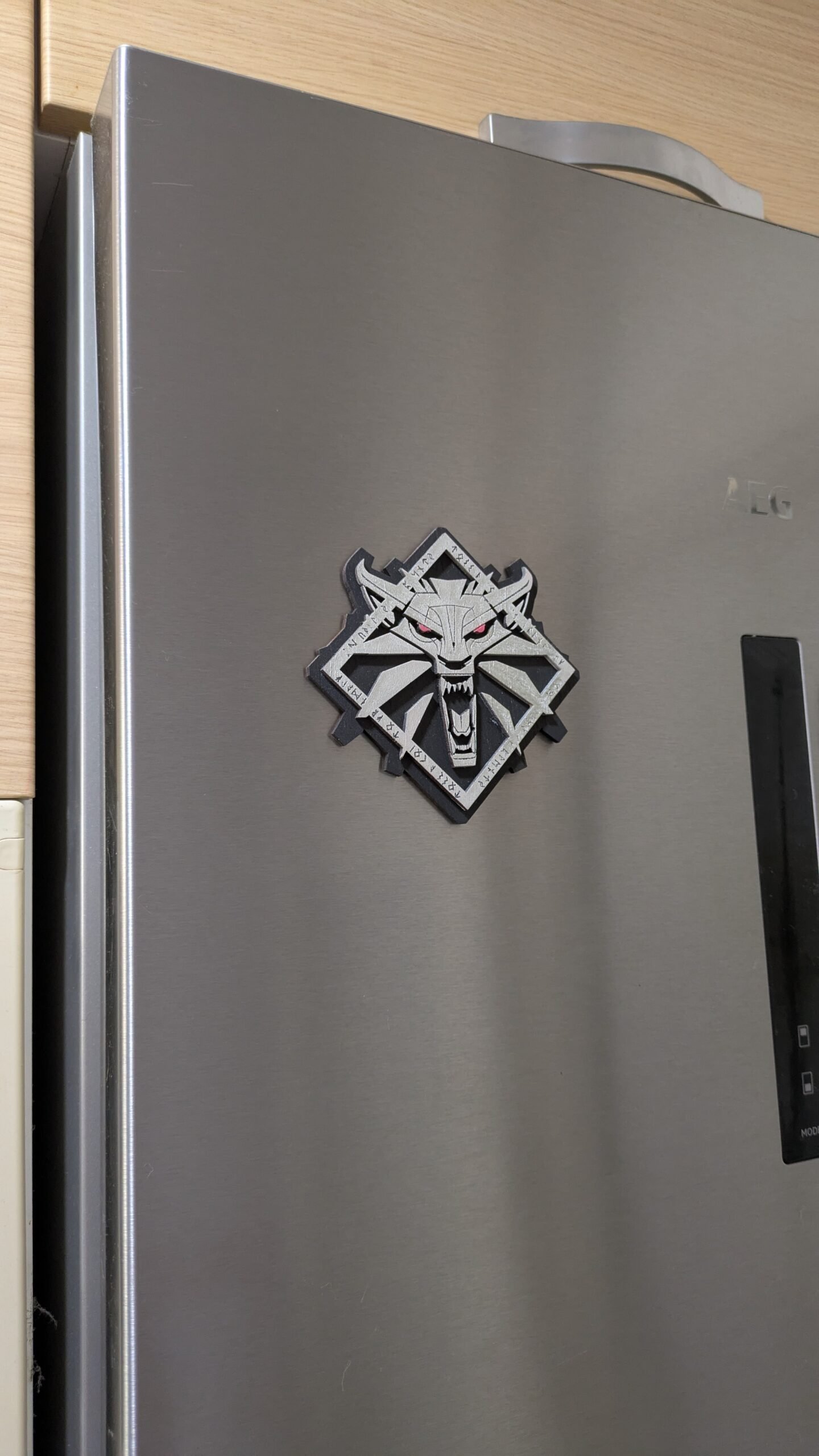 El medallón es el símbolo de cualquier brujo. No solo reacciona ante la presencia de magia o monstruo, sino que es el símbolo de la escuela de quien lo lleva. Y el más conocido, desde luego, es el de la Escula del Lobo de Kaer Morhen que cuelga del cuello de Geralt de Rivia. Puede que este no vibre ante la presencia de magia o monstruos (o sí, la verdad es que no lo he comprobado, pero no es imposible), pero sí que hará que tu frigorífico, tu PC o cualquier superficie metálica donde lo coloques quede bajo la protección de Geralt de Rivia (esto tampoco lo he comprobado, pero la verdad es que, pongas donde lo pongas, mola).