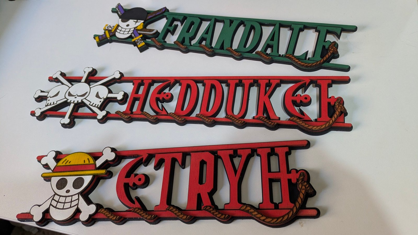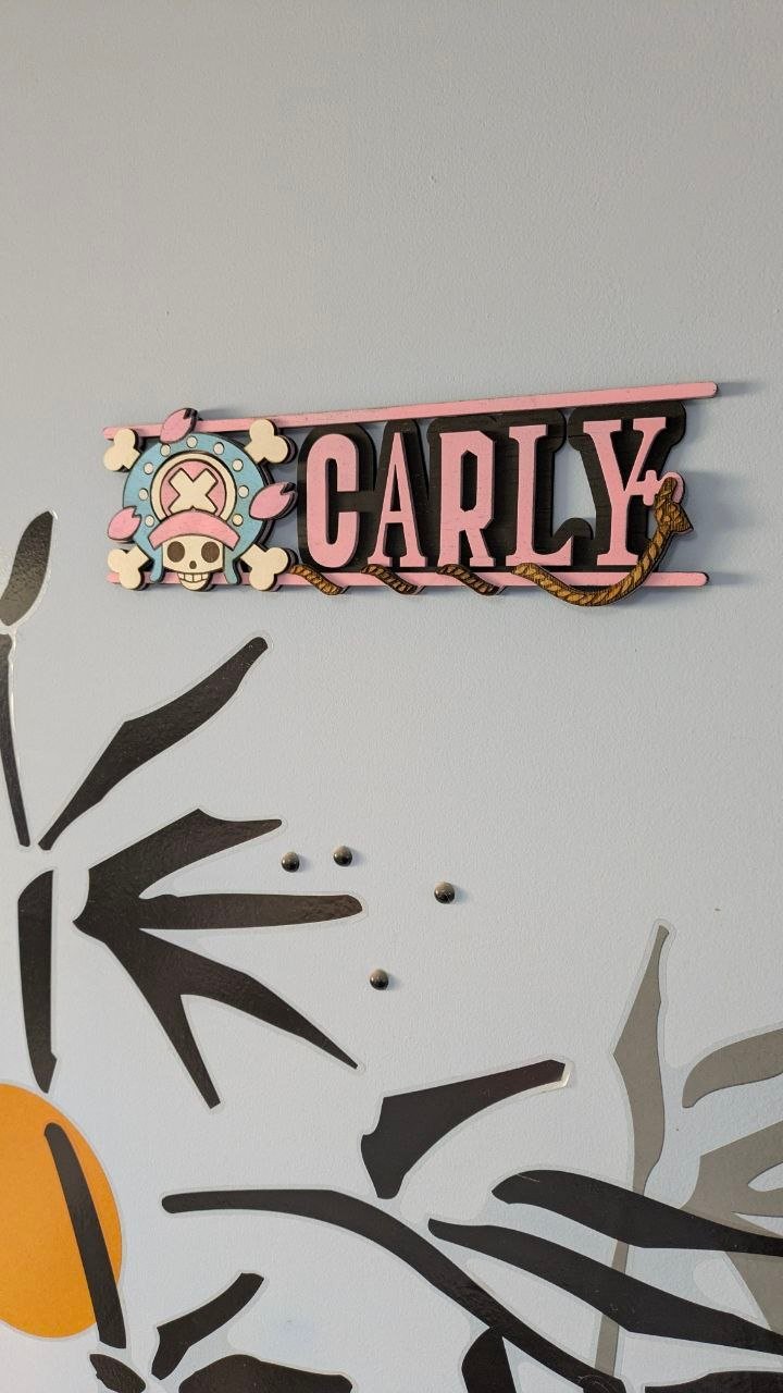 One Piece es una historia que te cala hondo. Es mucho, mucho más que una simple historia de piratas. Sus personajes están muy bien construidos y es habitual reír y llorar con ellos. Y, como todo, seguro que tienes un personaje favorito. ¿Qué te parecería lucir tu nombre con la bandera de tu pirata favorito en la pared? Y en madera, todo artesanal, que el plástico es cosa de Dragones Celestiales 😜.